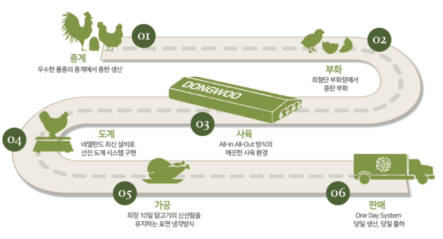 동우팜투테이블은 양계, 종란, 부화, 사육, 가공, 판매에 이르는 전 과정을 지휘총괄하는 사업을 영위하고 있다.