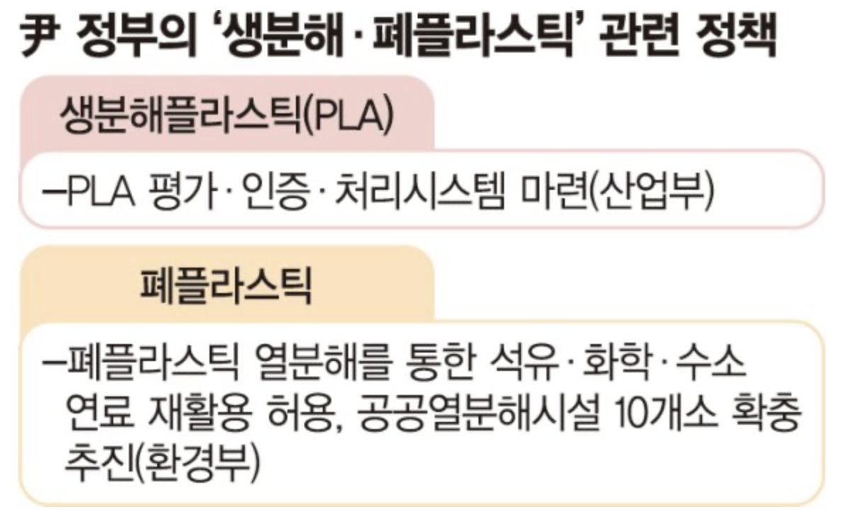 9일 발표된 윤석열 정부의 '110대 국정과제'에 따르면 윤석열 정부는 산업부와 PLA관련 평가·인증·처리시스템 마련을, 환경부와는 폐플라스틱 열분해를 통한 석유·화학·수소연료 재활용 허용 등을 서두를 계획이다.