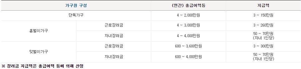 열심히 일은 하지만 소득이 적어 생활이 어려운 근로자, 사업자(전문직 제외) 또는 종교인 가구에 대해 가구원 구성과 총급여액 등에 따라 산정된 근로장려금을 지급함으로써 근로를 장려하고 실질소득을 지원하는 근로연계형 소득지원 제도