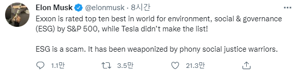 자신의 트위터를 통해 "(석유 기업) 엑손은 ESG 지수에서 세계 10위 내에 들었다.