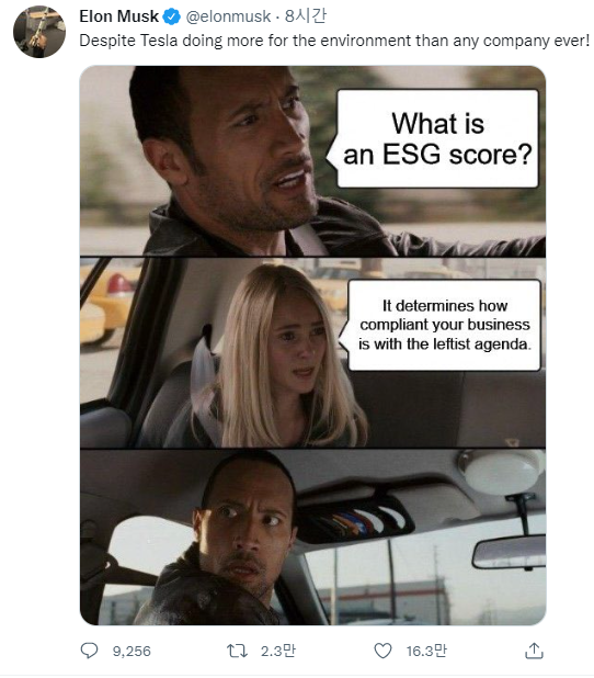 테슬라는 지난달 연례보고서를 통해 ESG 지수가 근본적으로 결함이 있다고 주장했었고, 일론 머스크도 "기업 ESG는 악마의 화신"이라며 강하게 비판했다.