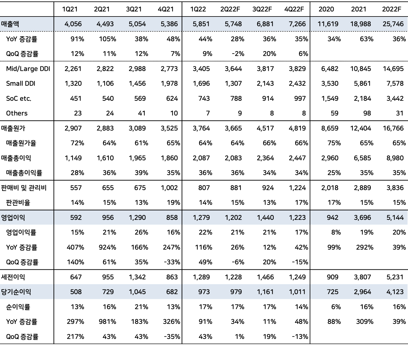 계절적 최대 비수기인 22년도 2분기에도 LX세미콘의 실적은 견조한 흐름이 이어질 전망이다.