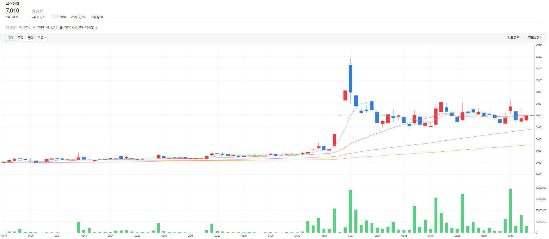 몇일동안 계속 횡보하던 고려산업의 주가가 다시 한번 크게 상승하였다.