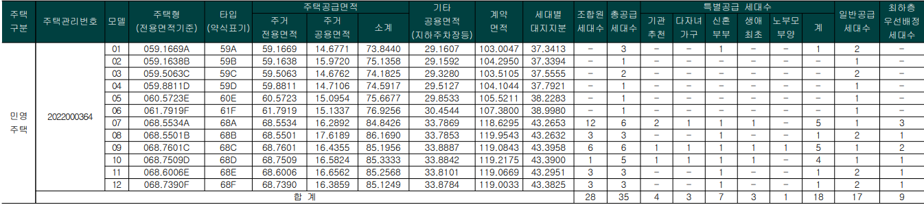 [조합원 : 28세대 제외, 일반공급 : 17세대, 특별공급 18세대(일반[기관추천] 4세대, 다자녀가구 3세대, 신혼부부 7세대, 생애최초 3세대, 노부모부양 1세대 포함)] 및 부대복리시설