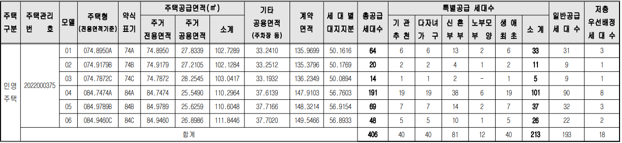 특별공급 213세대(일반[기관추천] 40세대, 다자녀가구 40세대, 신혼부부 81세대, 노부모부양 12세대, 생애최초 40세대 포함)