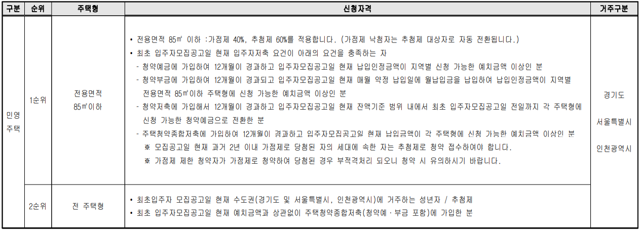 전 세대 전용면적 85㎡이하 주택으로 가점제 40%, 추첨제 60% 적용