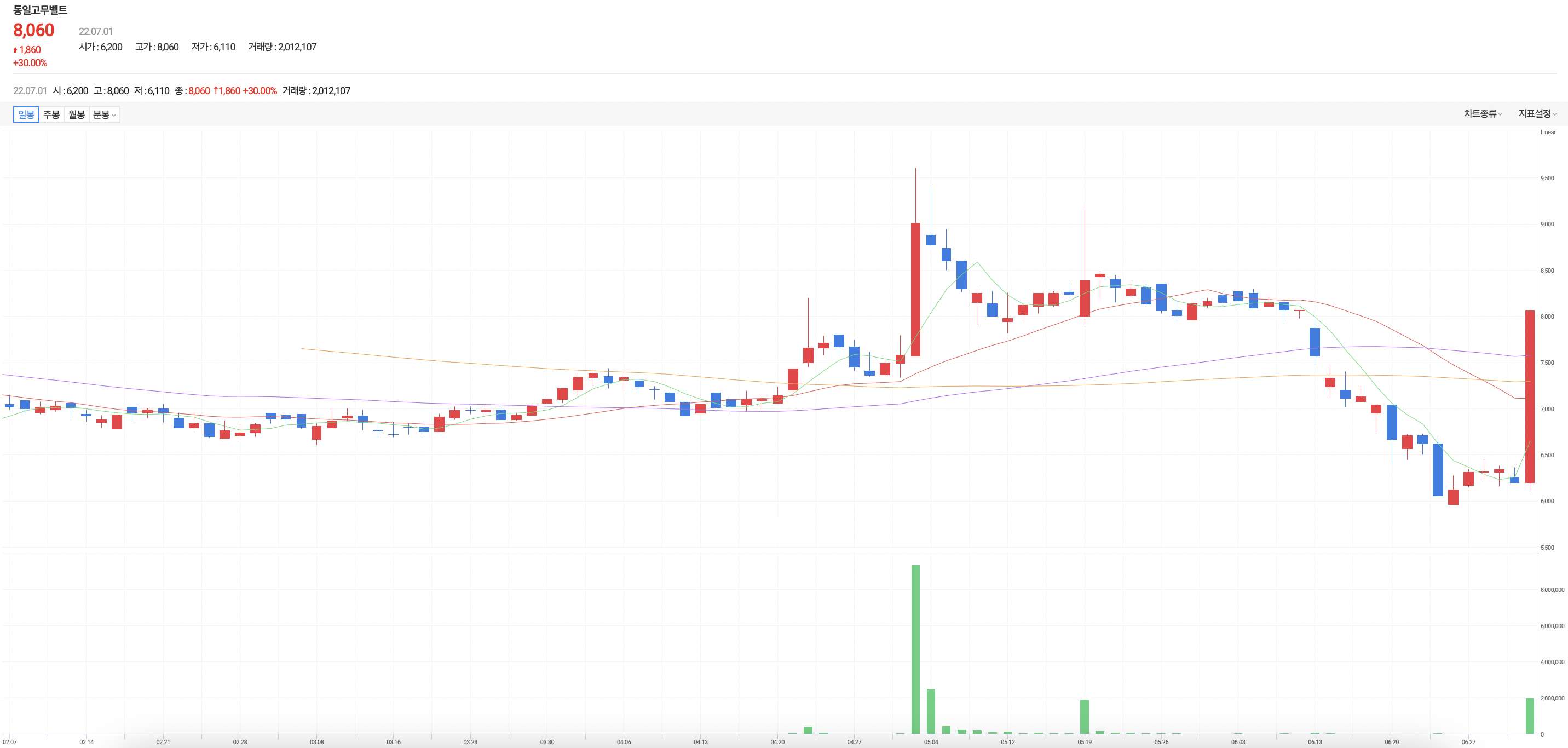 안 좋은 장에서 급등한 동일고무벨트의 주가
