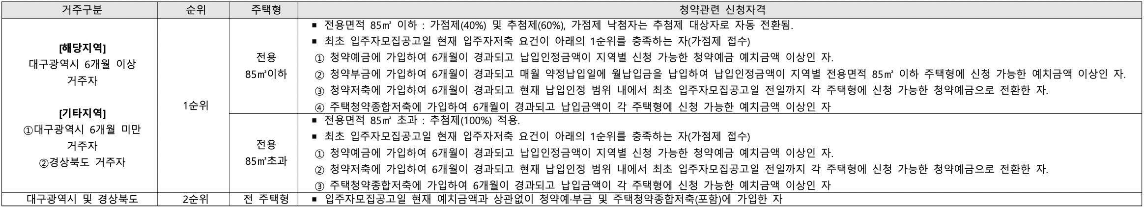 입주자모집공고일(2022년 07월 21일 목요일) 현재 대구광역시에 거주하거나 경상북도에 거주(주민등록표등본 기준)하는 만 19세 이상인 자 또는 세대주인 미성년자(자녀양육, 형제자매부양) 중 입주자저축 순위별 자격요건을 갖춘 자(국내에서 거주하는 재외동포 재외국민 외국국적 동포 및 외국인 포함)의 경우 청약이 가능합니다.