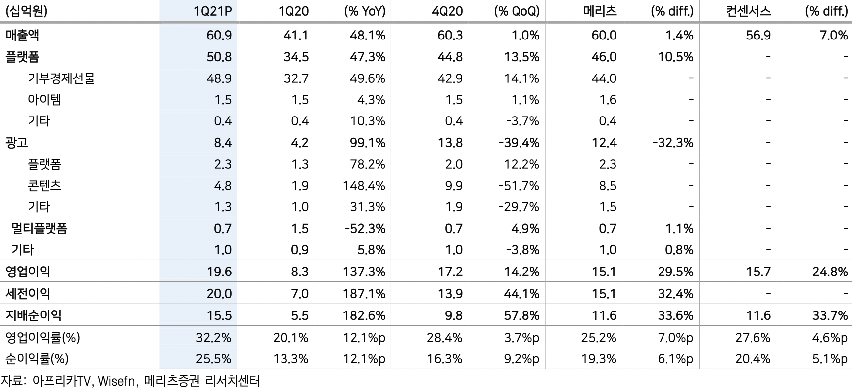• 21년 1분기 매출액 609억원 영업이익 196억 원으로 컨센서스(매출액 569억, 영업이익 157억원) 상회하는 어닝 서프라이즈 달성