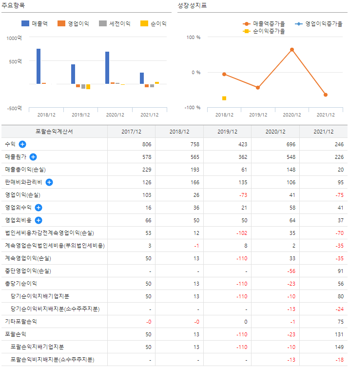 ● 코로나19 이후 중화권 디스플레이 패널업체들의 투자 지연으로 2021년 75억 원의 영업손실을 기록하였으나 2022년 적자폭을 대폭 개선하였고, 2023년에는 실적이 턴어라운드 될 것으로 전망