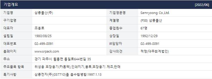 삼륭물산은 위생용 포장용기의 제조 및 판매를 목적으로 1980년 8월에 설립되었으며, 1992년 12월 코스닥 시장에 상장된 회사이다.