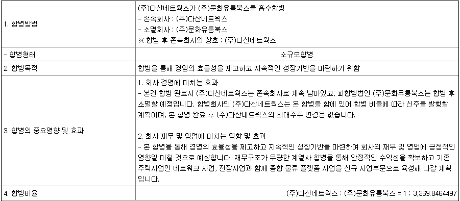 시간외 상한가 이유는 다산네트웍스가 문화유통북스 흡수합병을 통해 경영효율성을 높이고 종합 물류 플랫폼 사업을 직접 추진한다는 공시 때문이다.