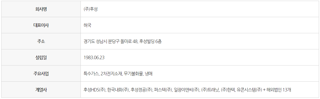 후성은 2006년 11월 화학, 신조재와 자동차 보조매트 부문의 사업영역 전문화를 목적으로 퍼스텍(주)으로부터 인적분할하여 설립, 불소를 기반으로 한 기초화합물의 제조, 판매업을 영위하고 있는 회사이다.