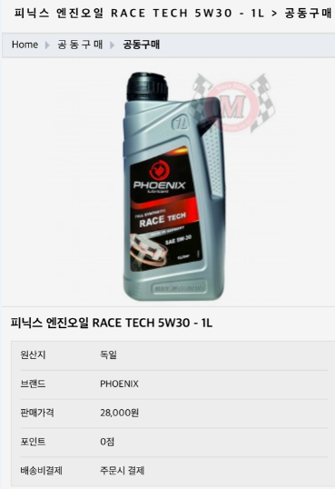 추전 해준 오일은 피닉스 엔진오일 RACE TECH 5W 30 - 1L