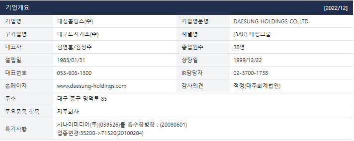 - 대성홀딩스는 2009년 10월 사업부문을 분할하여 신설법인 대구도시가스(현대성에너지)를 설립하였으며, 존속법인인 대성홀딩스는 지주회사로 전환하였다.