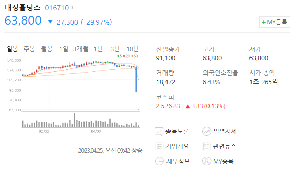 그리고 오늘도 대성홀딩스는 하한가 출발..
