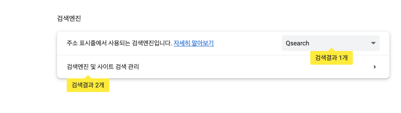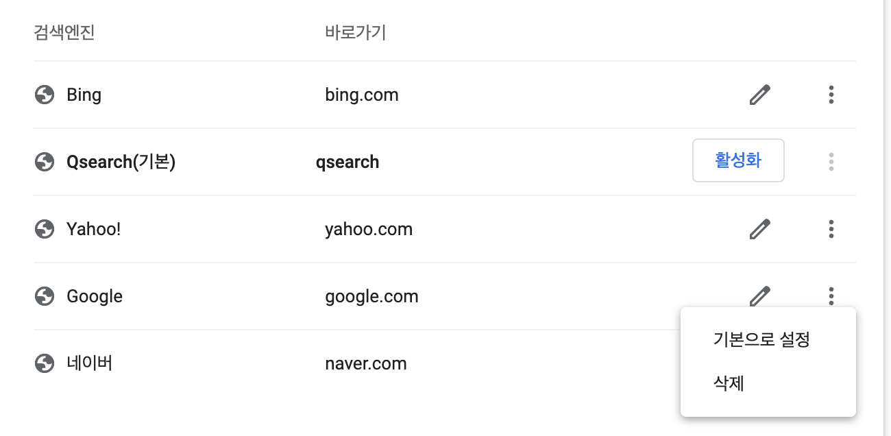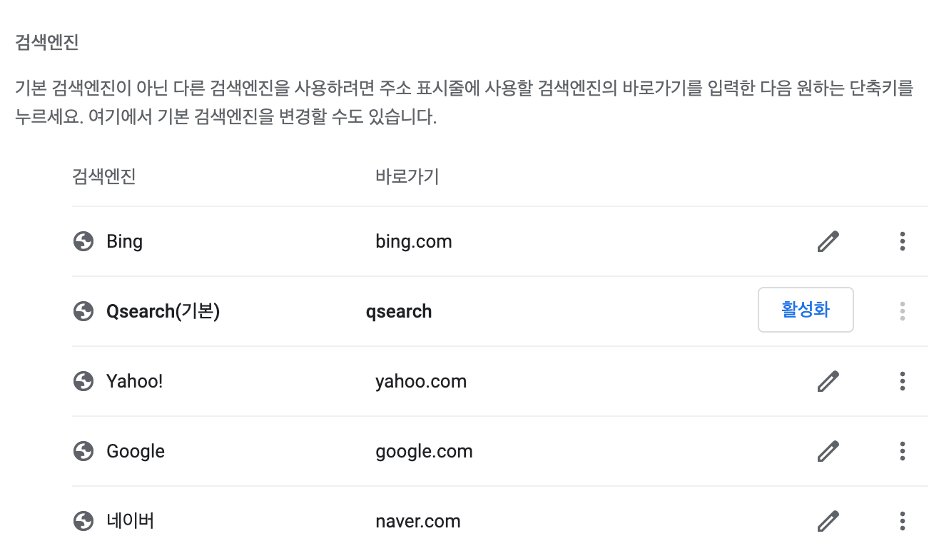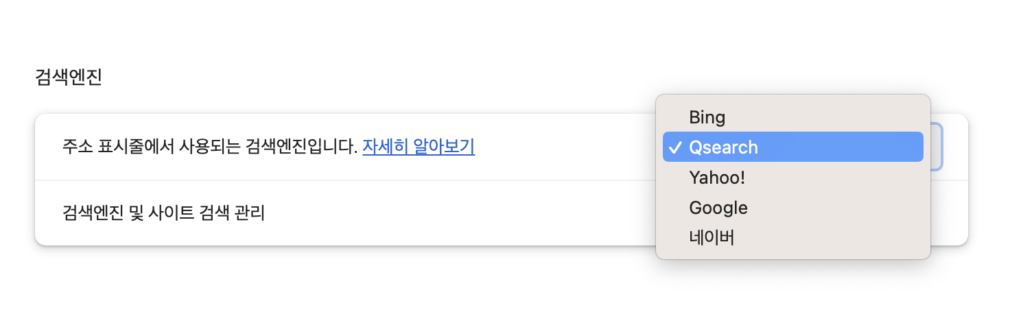 4. 들어가서 확인해 보시면 기본 검색엔진이 Qsearch로 설정되어 있을 겁니다.