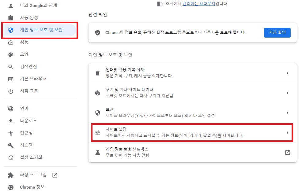 설정에 들어가신 후 왼쪽 화면에 보이는 개인 정보 보호 및 보안 탭을 누르신 후 사이트 설정에 들어가 주세요.