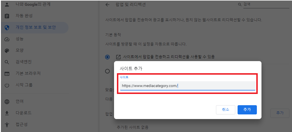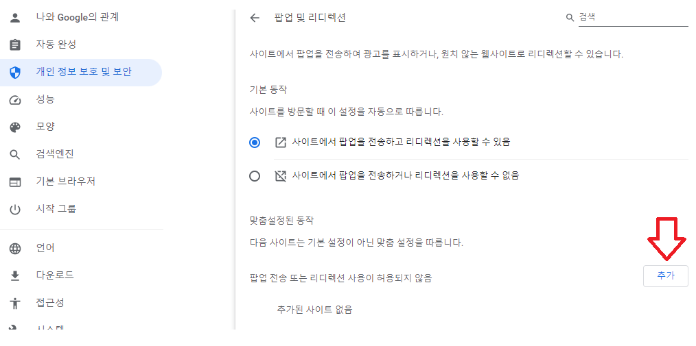 개인정보 및 보안 탭 아래쪽에 보시면 팝업 및 리디렉션에 뜨는 팝업 창 주소를 입력해 주시면 됩니다.