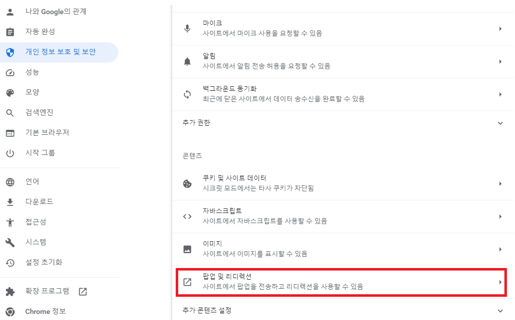 설정에 들어가신 후 왼쪽 화면에 보이는 개인 정보 보호 및 보안 탭을 누르신 후 사이트 설정에 들어가 주세요.