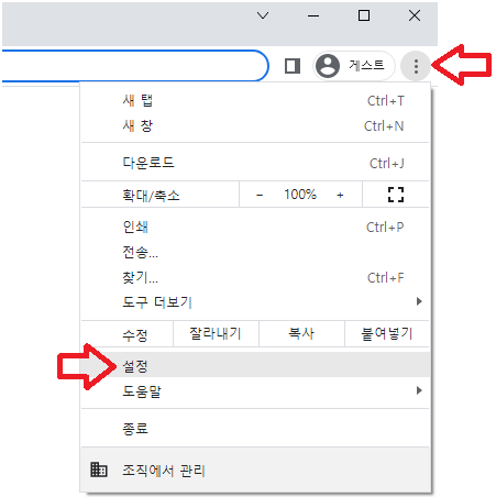 크롬 오른쪽 상단에 점 3개를 클릭하시면 설정이 보이실 겁니다.